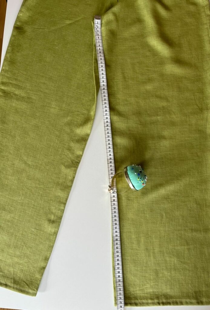 Prenez un pantalon qui vous va bien en longueur et posez-le à plat sur une table. Mesurez avec un mètre ou une règle la longueur qui va de l’entrejambe jusqu’en bas de votre pantalon comme sur la photo de droite. Cliquez sur la longueur du pantalon souhaitée une fois la taille choisie dans la boutique.